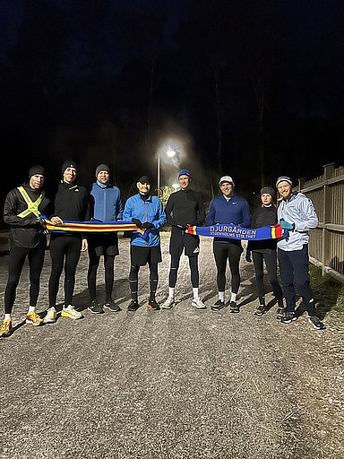 11 december 2024: En historisk bild med DIF Runnings första steg. Olle Walleräng och Olof Silvander guidade gänget från Stockholms Stadion till Norra Djurgårdsstaden för lite intervaller längs med Husarviken.